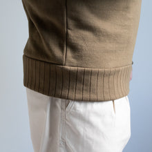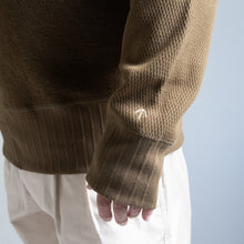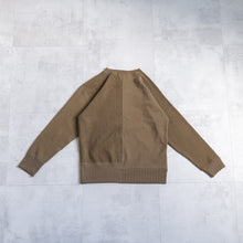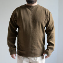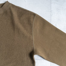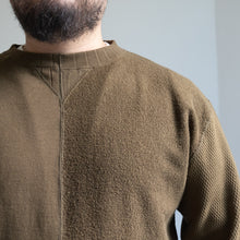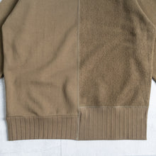 右身頃が1930年代、左身頃が1940年のディテールを再現しています。 異なった時代の異なったデザインを身頃が中央で大胆に繋ぎ合わせています。リブの編地や幅などの違いが年代の違いです。そこにさらに60年代の仕様も加えました。60年代はこの時代に登場したフラットシーマミシン。布と布を突合せて重なりを排除し縫製目を軽く薄く仕上げる手法です。全てが同色の中でまとまられていますので、一見はシンプルなアイテムに見えますが、ナイジェル・ケーボンならではの特性が集約した逸品です。