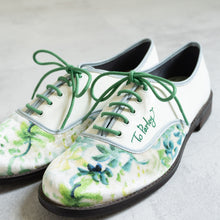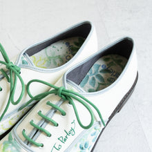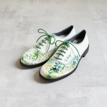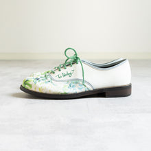 草たちの幻想的で儚い雰囲気の水彩画をベルベットにプリント。さらにサイドに本革を使用することによって落ち着いた一足になっています。憂いな雰囲気でありながらも存在感のある大人のスタイルに。
